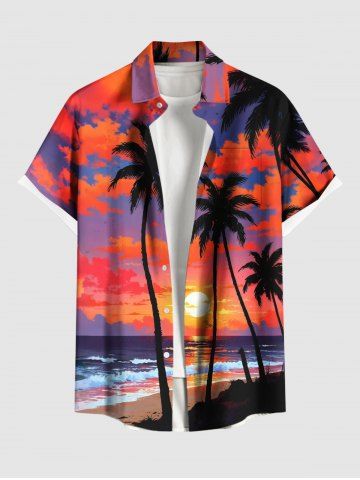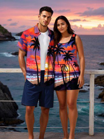 Matching Hawaiian Outfits > Matching Hawaii Shirt and Romper Plus Size Beach Outfit Coconut Tree Cloud Sun Seascape Printed for Couples