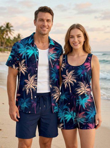Matching Hawaiian Outfits > Matching Hawaii Shirt and Romper Plus Size Beach Outfit Coconut Tree Galaxy Print For Couples