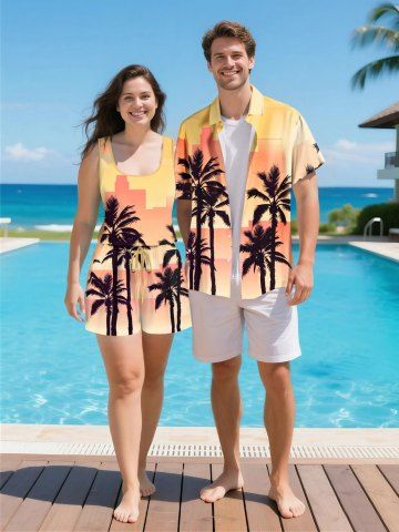 Matching Hawaiian Outfits > Matching Hawaii Shirt and Romper Plus Size Beach Outfit Coconut Tree Ombre Printed for Couples