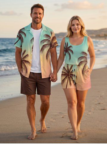 Matching Hawaiian Outfits > Matching Hawaii Shirt and Romper Plus Size Beach Outfit Coconut Tree Ombre Printed for Couples