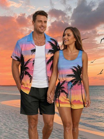 Matching Hawaiian Outfits > Matching Hawaii Shirt and Romper Plus Size Beach Outfit Coconut Tree Ombre Sky Cloud Printed for Couples