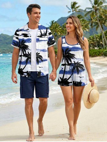 Matching Hawaiian Outfits > Matching Hawaii Shirt and Romper Plus Size Beach Outfit Coconut Tree Sea Print For Couples