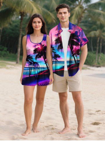 Matching Hawaii Shirt and Romper Plus Size Beach Outfit Coconut Tree Seascape Cloud Print for Couples - Purple