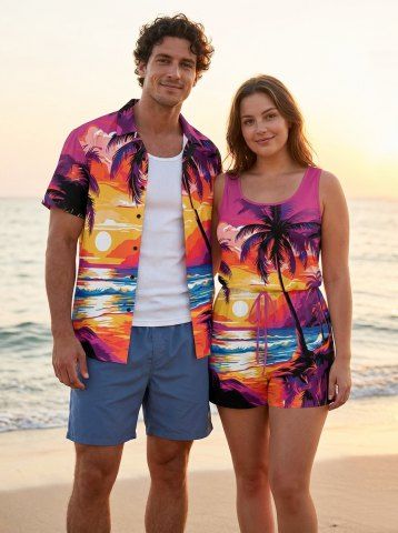 Matching Hawaiian Outfits > Matching Hawaii Shirt and Romper Plus Size Beach Outfit Coconut Tree Sun Seascape Printed for Couples