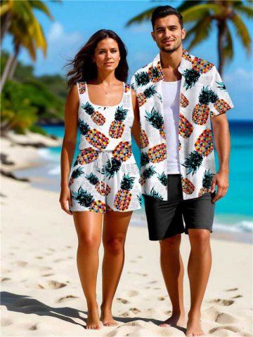 Matching Hawaiian Outfits > Matching Hawaii Shirt and Romper Plus Size Beach Outfit Colorful Geometric Colorblock Pineapple Print For Couples
