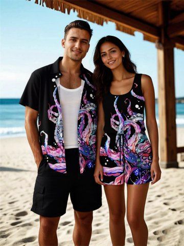 Matching Hawaii Shirt and Romper Plus Size Beach Outfit Colorful Octopus Dots Printed for Couples - Black