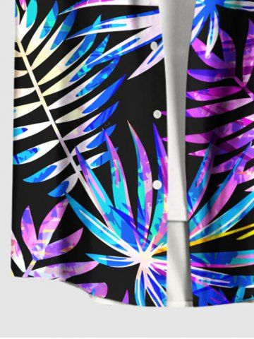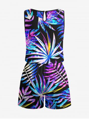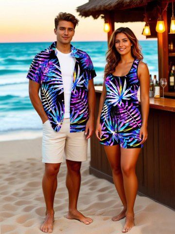Matching Hawaii Shirt and Romper Plus Size Beach Outfit Colorful Tropical Leaf Printed for Couples - Purple