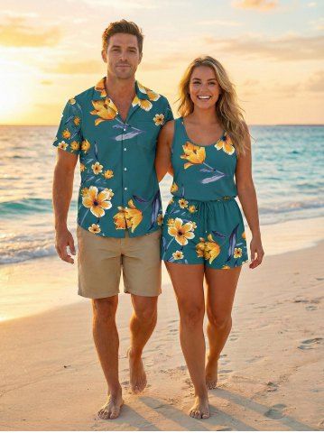 Matching Hawaiian Outfits > Matching Hawaii Shirt and Romper Plus Size Beach Outfit Flower Leaf Branch Print For Couples