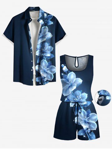 Matching Hawaiian Outfits > Matching Hawaii Shirt and Romper Plus Size Beach Outfit Flowers Glitter 3D Printed for Couples