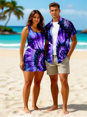Matching Hawaiian Outfits > Matching Hawaii Shirt and Romper Plus Size Beach Outfit Spiral Tie Dye Galaxy Print For Couples