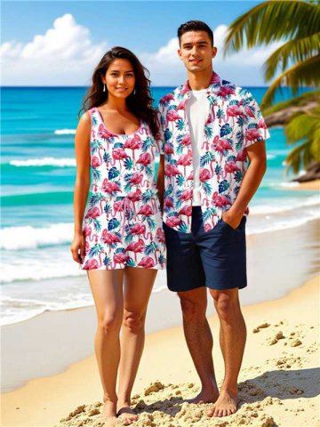 Matching Hawaiian Outfits > Matching Hawaii Shirt and Romper Plus Size Beach Outfit Tropical Flamingo Tropical Leaf Printed for Couples