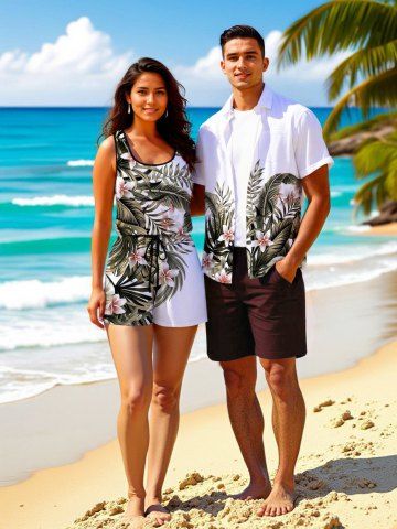 Matching Hawaiian Outfits > Matching Hawaii Shirt and Romper Plus Size Beach Outfit Tropical Leaf Hibiscus Printed for Couples