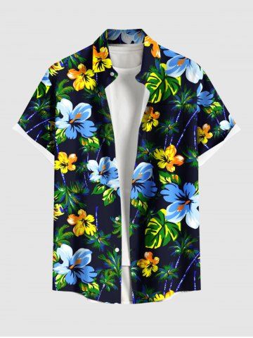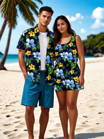 Matching Hawaiian Outfits > Matching Hawaii Shirt and Romper Plus Size Beach Outfit Tropical Leaf Hibiscus Printed for Couples