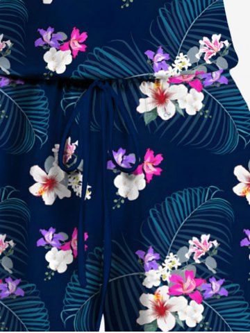 Matching Hawaii Shirt and Romper Plus Size Beach Outfit Tropical Leaf Hibiscus Printed for Couples - Midnight Blue
