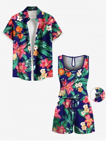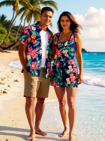 Matching Hawaiian Outfits > Matching Hawaii Shirt and Romper Plus Size Beach Outfit Tropical Leaf Flower Print For Couples