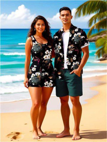 Matching Hawaiian Outfits > Matching Hawaii Shirt and Romper Plus Size Beach Outfit Tropical Leaf Flower Print For Couples