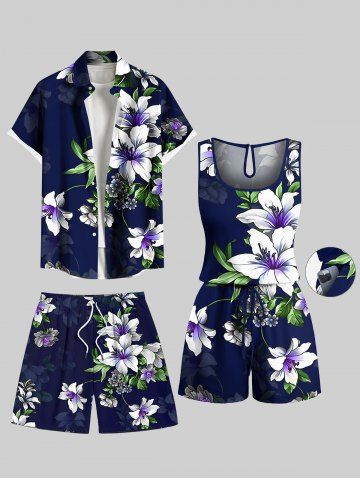 Matching Hawaiian Outfits > Matching Hawaii Shirt Short and Romper Plus Size Beach Outfit Lily Flower Leaf Print For Couples