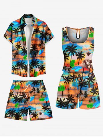 Matching Hawaiian Outfits > Matching Hawaii Shirt Shorts and Romper Plus Size Beach Outfit Coconut Tree Cloud Colorful Sky Print For Couples