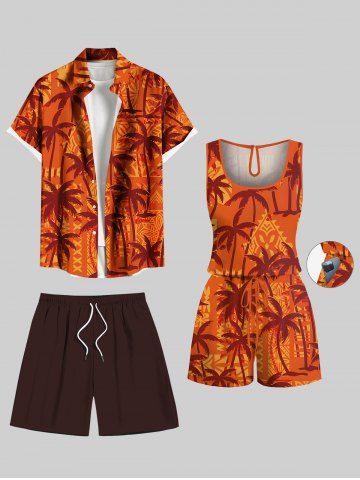 Matching Hawaii Shirt Shorts and Romper Plus Size Beach Outfit Coconut Tree Ethnic Print For Couples - Orange