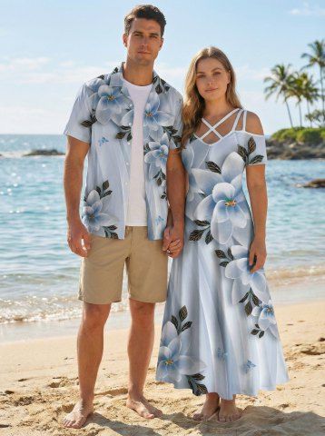 Matching Hawaiian Outfits > Ombre Flower Leaf Butterfly Print Plus Size Matching Hawaii Beach Outfit For Couples