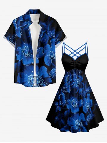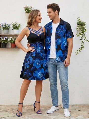 Ombre Flower Print Plus Size Matching Hawaii Beach Outfit For Couples - Deep Blue