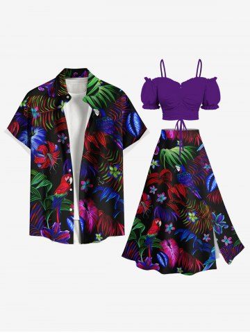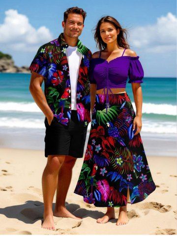 Matching Hawaiian Outfits > Ombre Tropical Leaf Hibiscus Flower Parrot Print Plus Size Matching Hawaii Beach Outfit For Couples