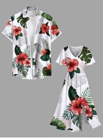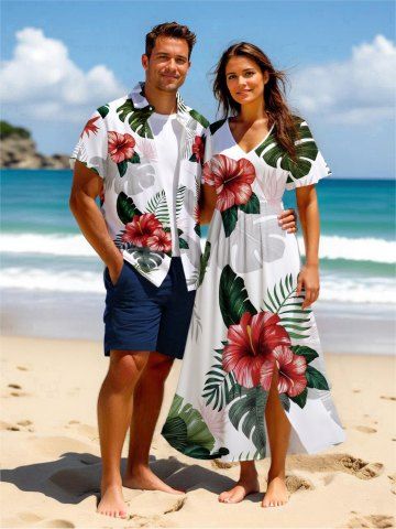 Matching Hawaiian Outfits > Ombre Tropical Leaf Hibiscus Flower Print Plus Size Matching Hawaii Beach Outfit For Couples