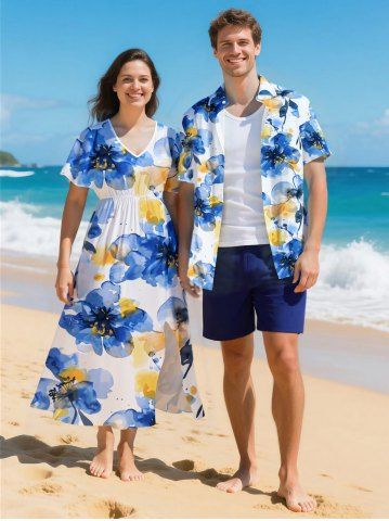 Matching Hawaiian Outfits > Ombre Watercolor Flower Print Plus Size Matching Hawaii Beach Outfit For Couples