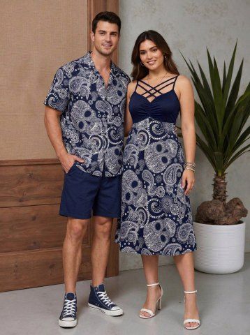 Paisley Floral Skull Print Plus Size Matching Hawaii Beach Outfit For Couples - Deep Blue