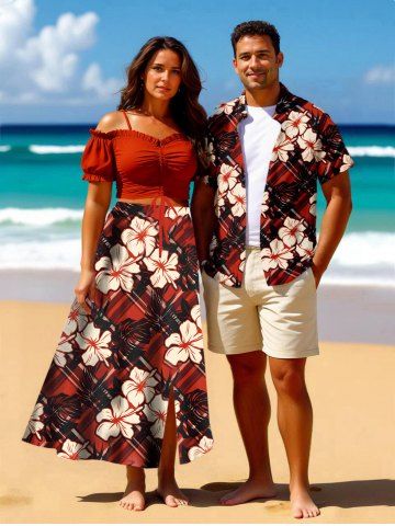 Matching Hawaiian Outfits > Plaid Hibiscus Flower Tropical Leaf Print Plus Size Matching Hawaii Beach Outfit For Couples