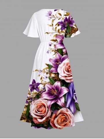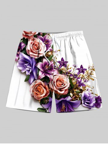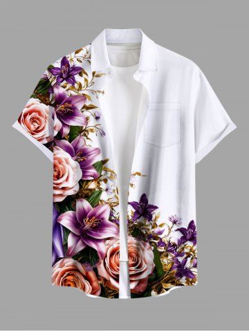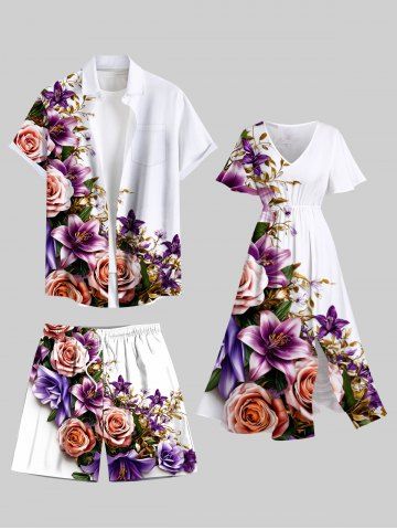 Rose Flower Leaf Print Plus Size Matching Hawaii Beach Outfit For Couples - Purple