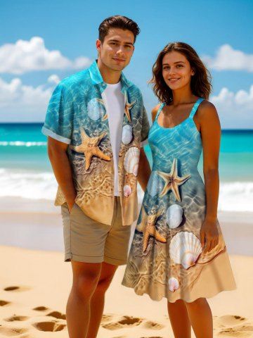 Matching Hawaiian Outfits > Sea Ripples Beach Starfish Print Plus Size Matching Hawaii Beach Outfit For Couples