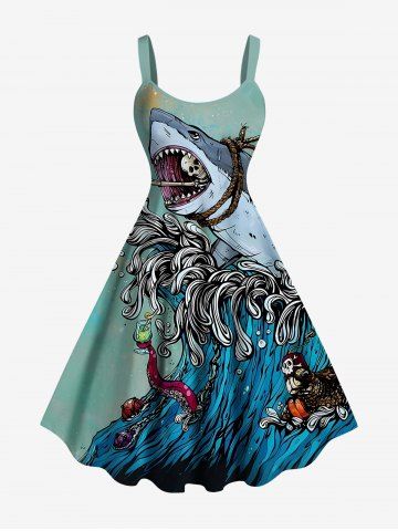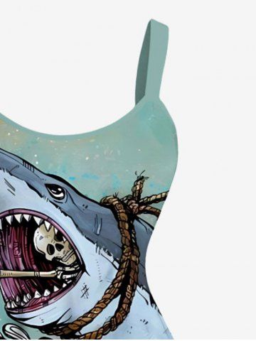 Shark Skull Skeleton Sea Waves Print Plus Size Matching Hawaii Beach Outfit For Couples - Blue Gray