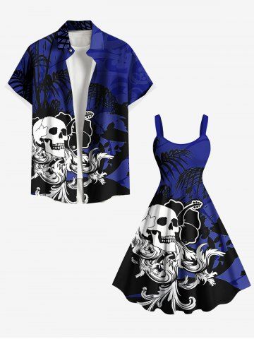 Matching Hawaiian Outfits > Skull Hibiscus Flowers Tropical Leaf Print Plus Size Matching Hawaii Beach Outfit For Couples