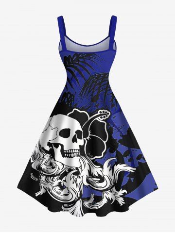 Skull Hibiscus Flowers Tropical Leaf Print Plus Size Matching Hawaii Beach Outfit For Couples - Blue