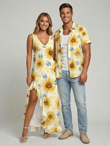 Matching Hawaiian Outfits > Sunflowers Leaf Print Plus Size Matching Hawaii Beach Outfit For Couples