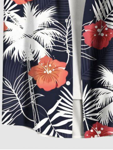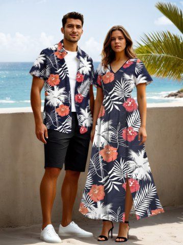Matching Hawaiian Outfits > Tropical Leaf Coconut Tree Hibiscus Flower Print Plus Size Matching Hawaii Beach Outfit For Couples