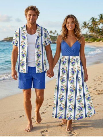 Matching Hawaiian Outfits > Tropical Leaf Flower Striped Print Plus Size Matching Hawaii Beach Outfit For Couples