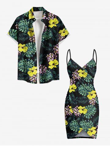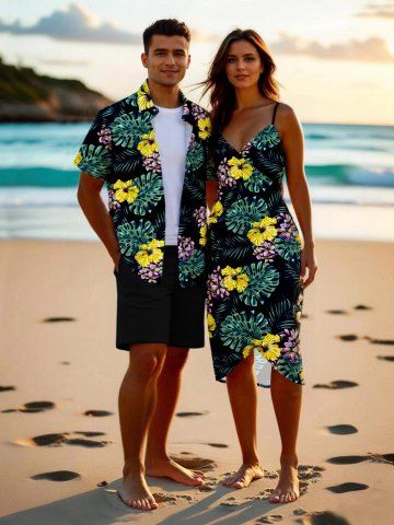 Matching Hawaiian Outfits > Tropical Leaf Hibiscus Flower Print Plus Size Matching Hawaii Beach Outfit For Couples