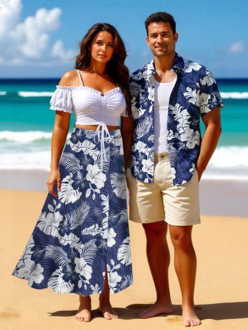 Matching Hawaiian Outfits > Tropical Leaf Hibiscus Flower Print Plus Size Matching Hawaii Beach Outfit For Couples
