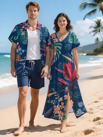Matching Hawaiian Outfits > Tropical Leaf Hibiscus Flower Print Plus Size Matching Hawaii Beach Outfit For Couples