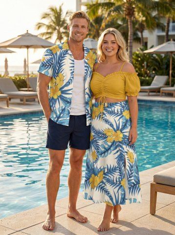 Matching Hawaiian Outfits > Tropical Leaf Hibiscus Flower Print Plus Size Matching Hawaii Beach Outfit For Couples