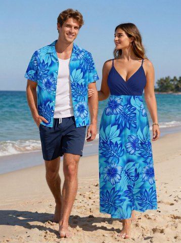 Matching Hawaiian Outfits > Tropical Leaf Hibiscus Flower Print Plus Size Matching Hawaii Beach Outfit For Couples