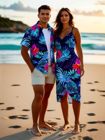 Matching Hawaiian Outfits > Tropical Leaf Hibiscus Flowers Print Plus Size Matching Hawaii Beach Outfit For Couples