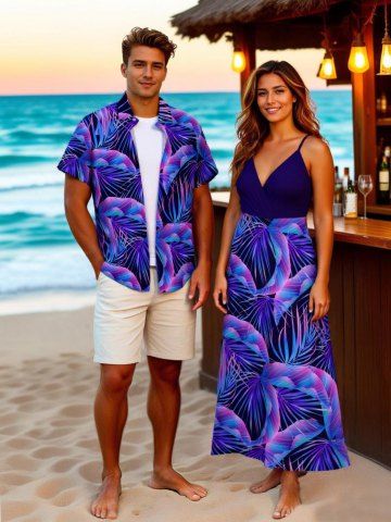 Matching Hawaiian Outfits > Tropical Leaf Print Plus Size Matching Hawaii Beach Outfit For Couples