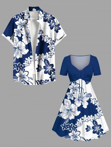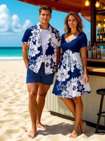 Matching Hawaiian Outfits > Two Tone Hibiscus Flowers Colorblock Print Plus Size Matching Hawaii Beach Outfit For Couples