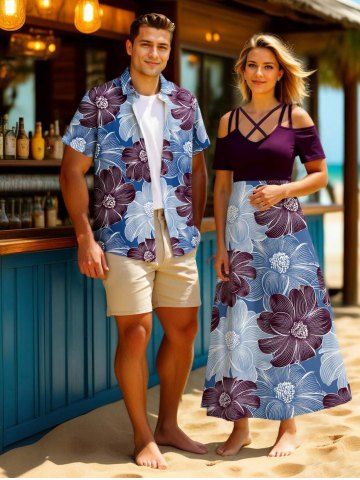 Matching Hawaiian Outfits > Two Tone Line Flower Print Plus Size Matching Hawaii Beach Outfit For Couples