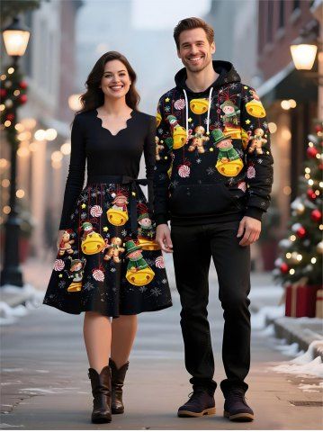 Matching Outfits > Christmas Candy Snowflake Swnoman Bell Gingerbread Print Plus Size Matching Outfit For Couples