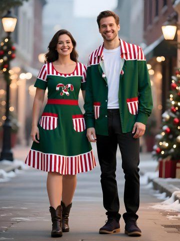 Matching Outfits > Christmas Elf Candy Stripes Print Plus Size Matching Outfit For Couples
