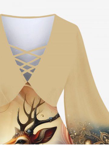 Christmas Elk Flowers Waves Print Plus Size Matching Set - Apricot